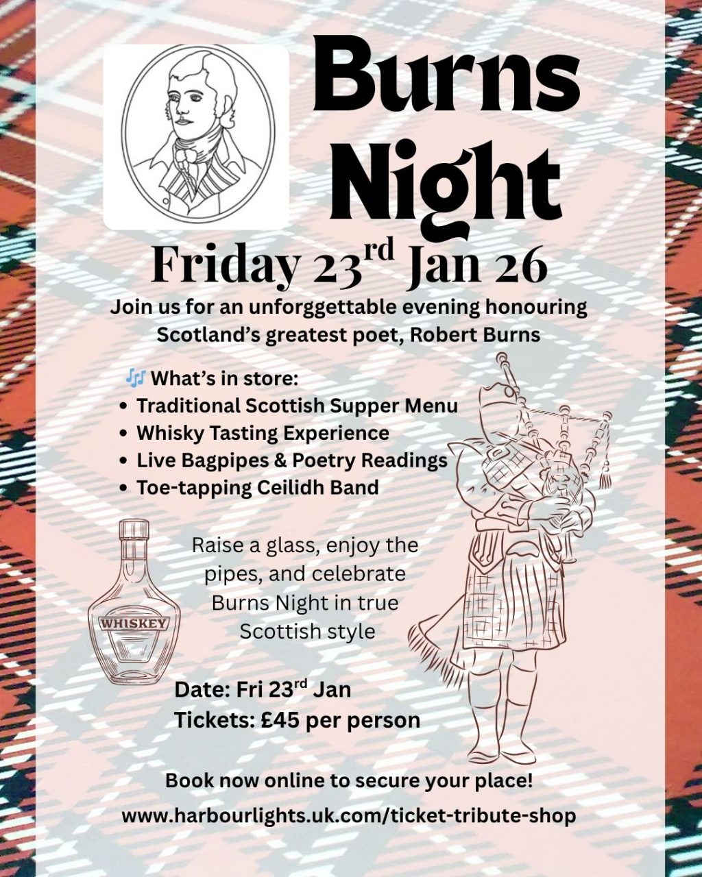 Join us for a truly Scottish evening packed with bagpipes, poetry, and plenty of whisky!