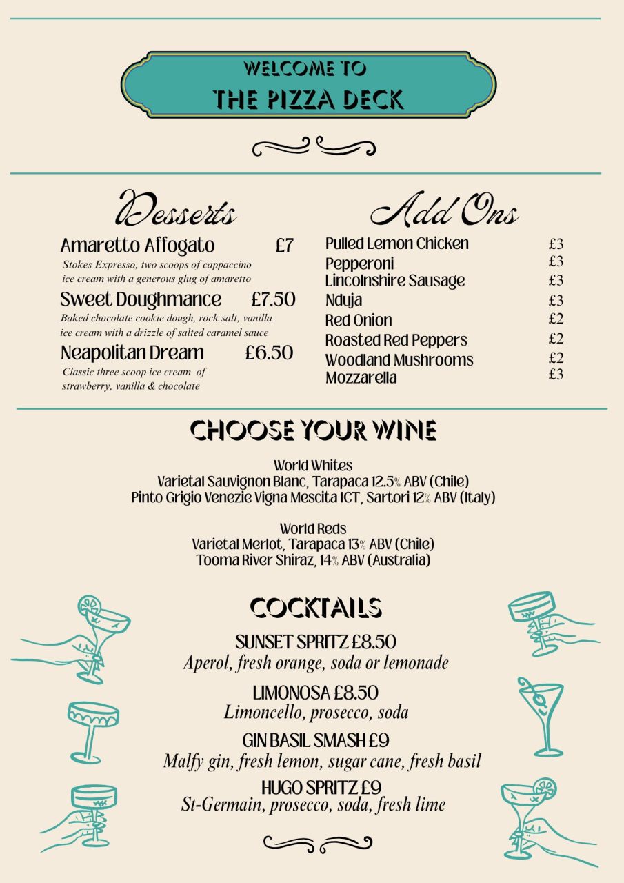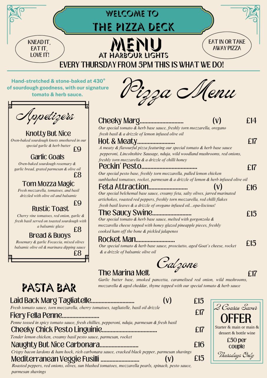 Pizza Deck Menu only on Thursdays serving food 5-8.45pm.